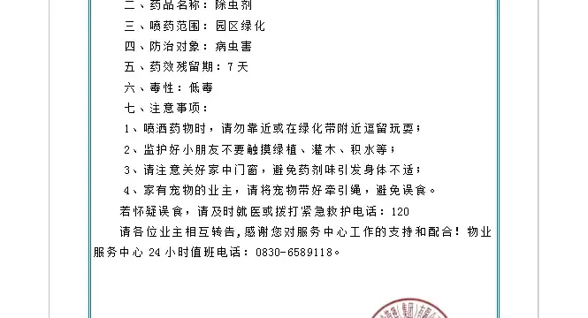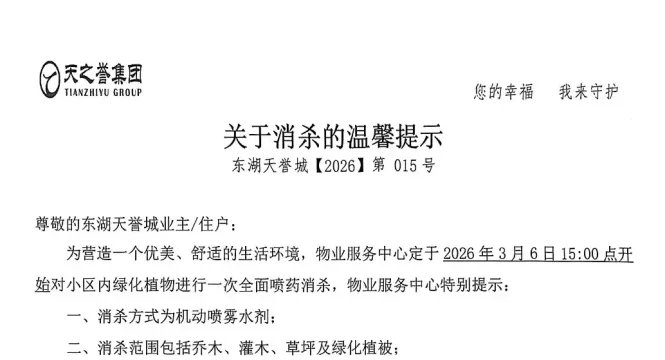 尊敬的天誉未来城业主/使用人: 为营造一个优美、舒适的生活环境,物业服务中心定于2026年3月6日下午16:00点开始对小区内绿化植物进行一次全面喷药消杀, ...