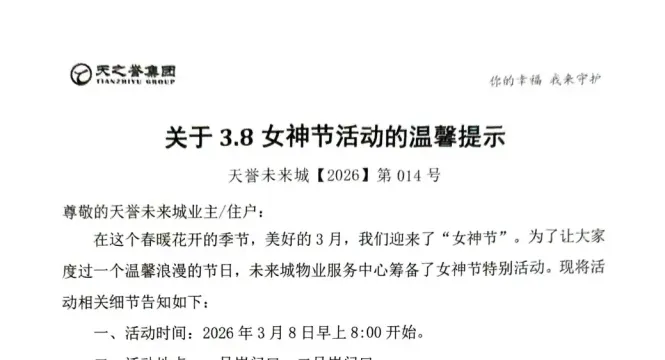 本帖最后由 陈莲 于 2025-3-27 08:40 编辑 尊敬的业主: 为了保障您和他人的身体和财产安全,天誉合府物业服务中心在此提示您: 一、根据《中华 ...
